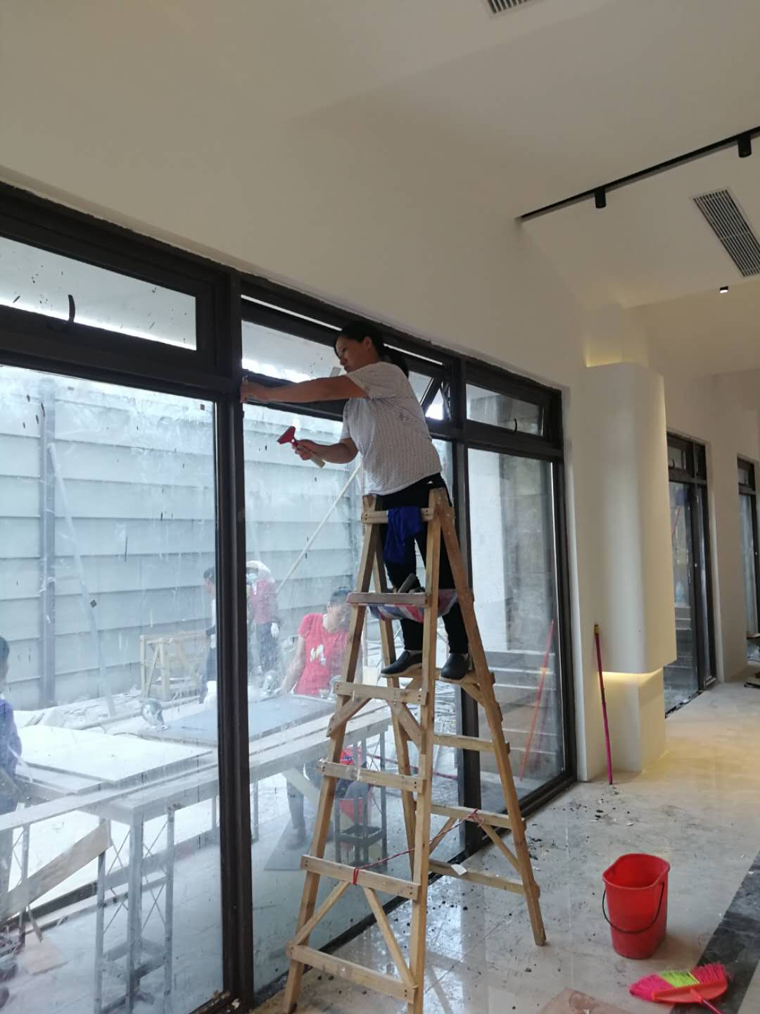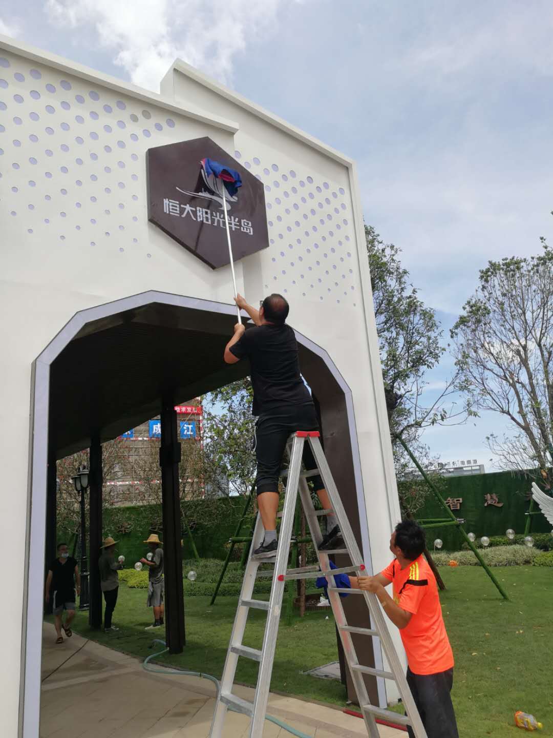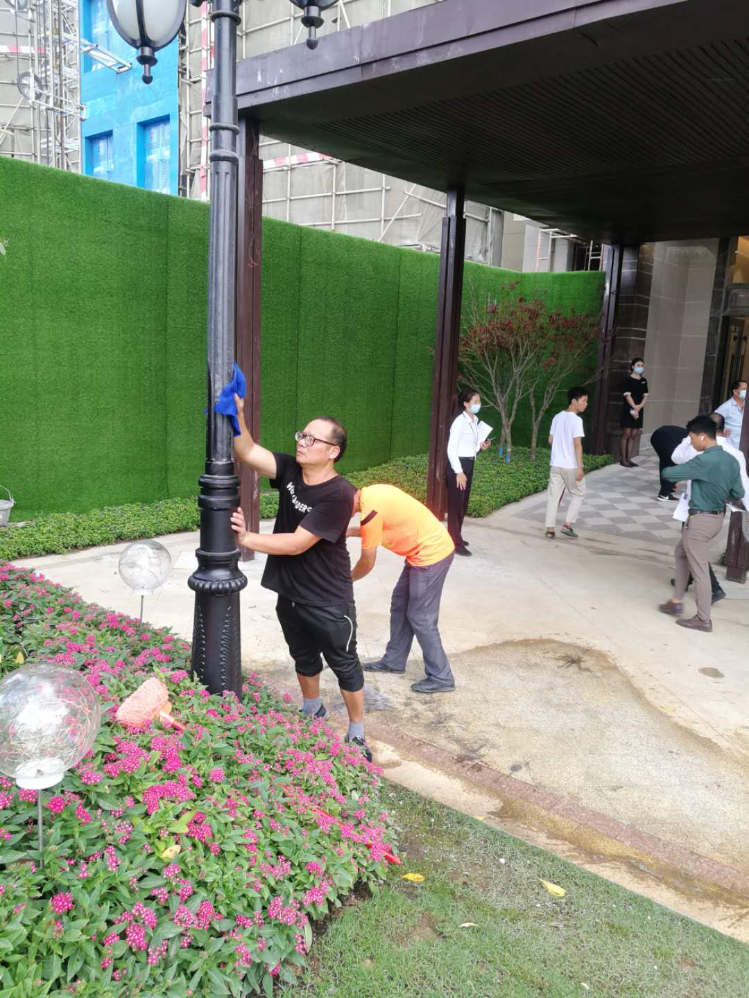 2020年7月24日。我司到南沙恒大阳光半岛进行楼盘案场的开荒清洁工作,主要的工作有:对现场的玻璃进行擦拭,利用专用的清洁剂对玻璃进行擦拭,保证玻璃的干净,其次就是对花园的灯柱还有灯泡进行清洁,保洁人员任务分配明细,保证卫生的干净整洁。达到恒大的卫生要求。以下为公司保洁人员工作照: