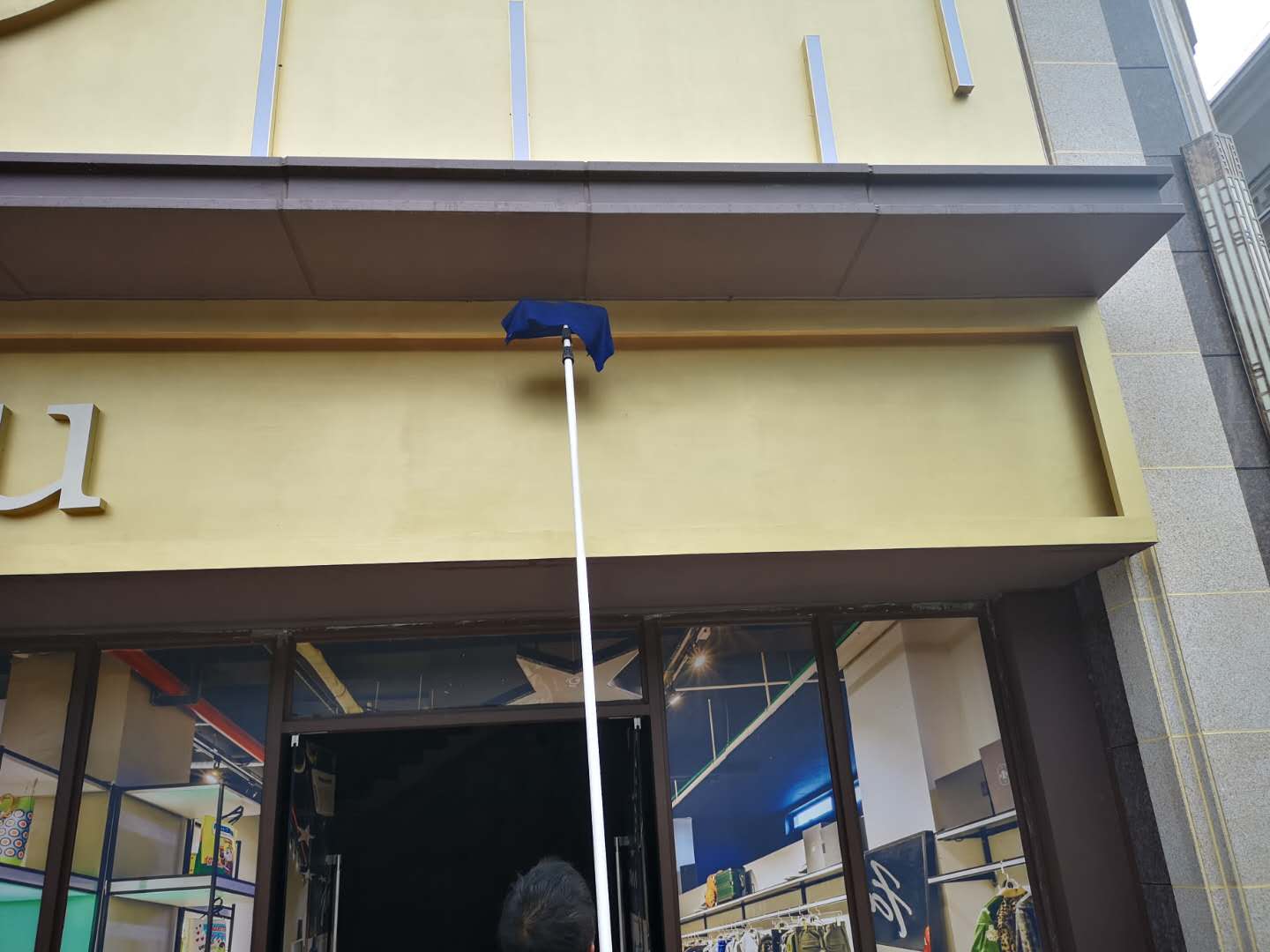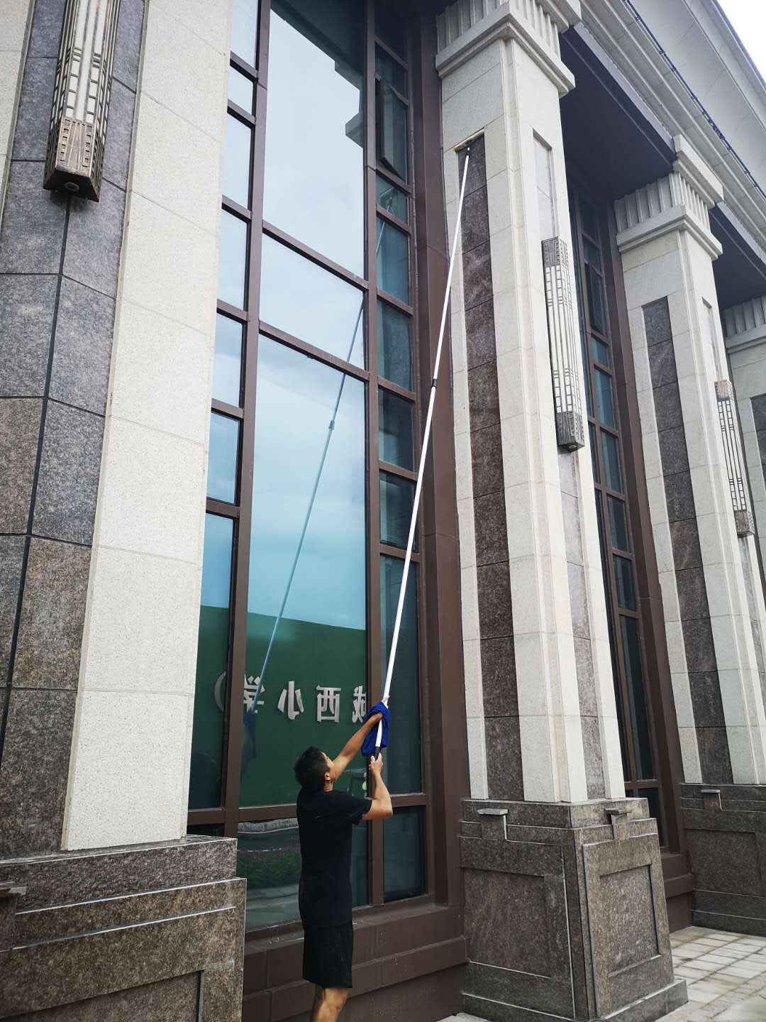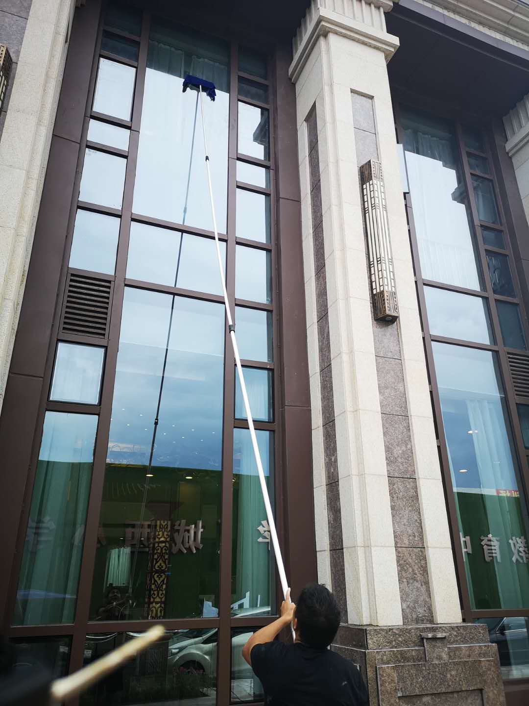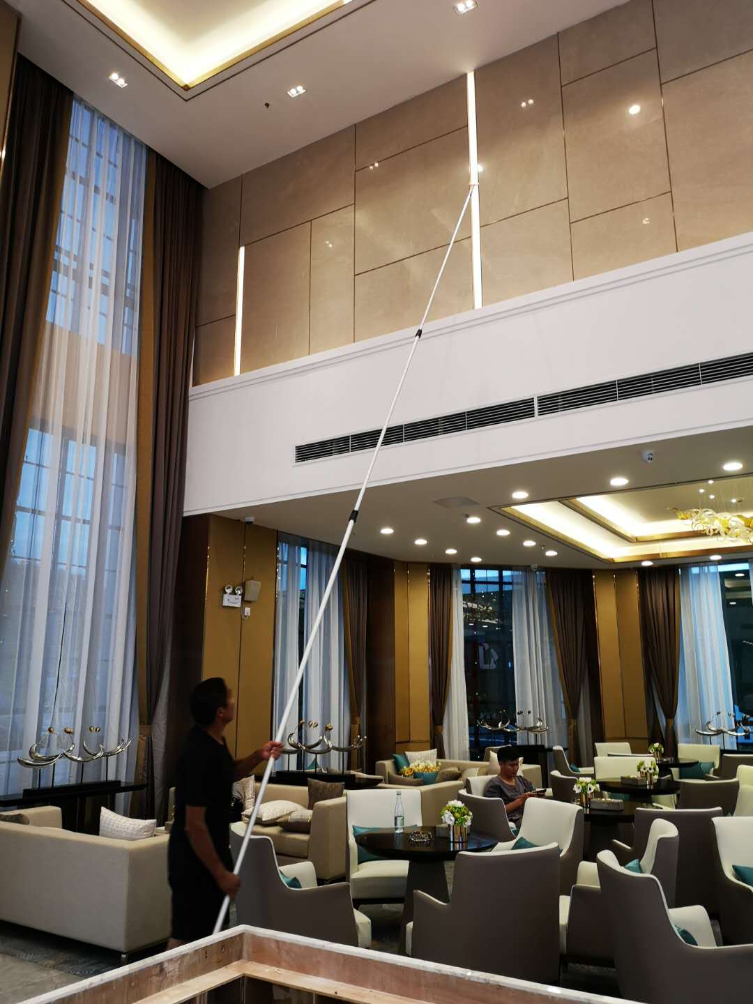 2020年8月,我司保洁人员在肇庆恒大帝景中心进行保洁工作,当日的工作安排;对销售中心里面的高处瓷砖地方进行清洁,利用伸缩杆加刮刷进行墙体还有高处玻璃的全面清洁擦拭工作,以下为工作人员认真有序的工作中: