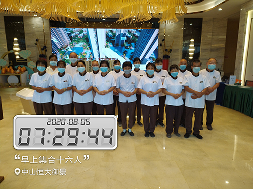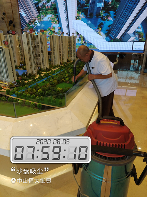 2020年8月5日,我司(广州鹰锐环境有限公司)保洁人员早上七点半准时集合在中山恒大御景中心楼盘,保洁人员穿着整洁,当日工作分配完后,大家认真执行对楼盘的各死角卫生进行清理清洁;沙盆吸尘、三栋样板间大扫除、四栋样板房清理蚊虫等工作,工作进行的井井有条。