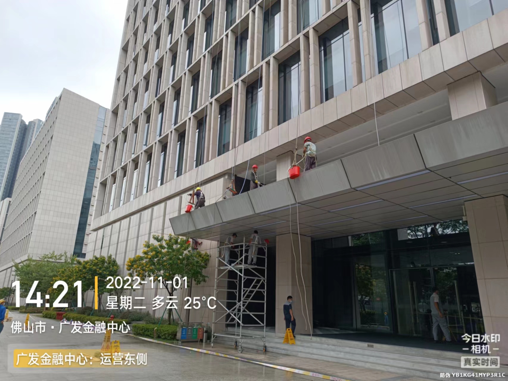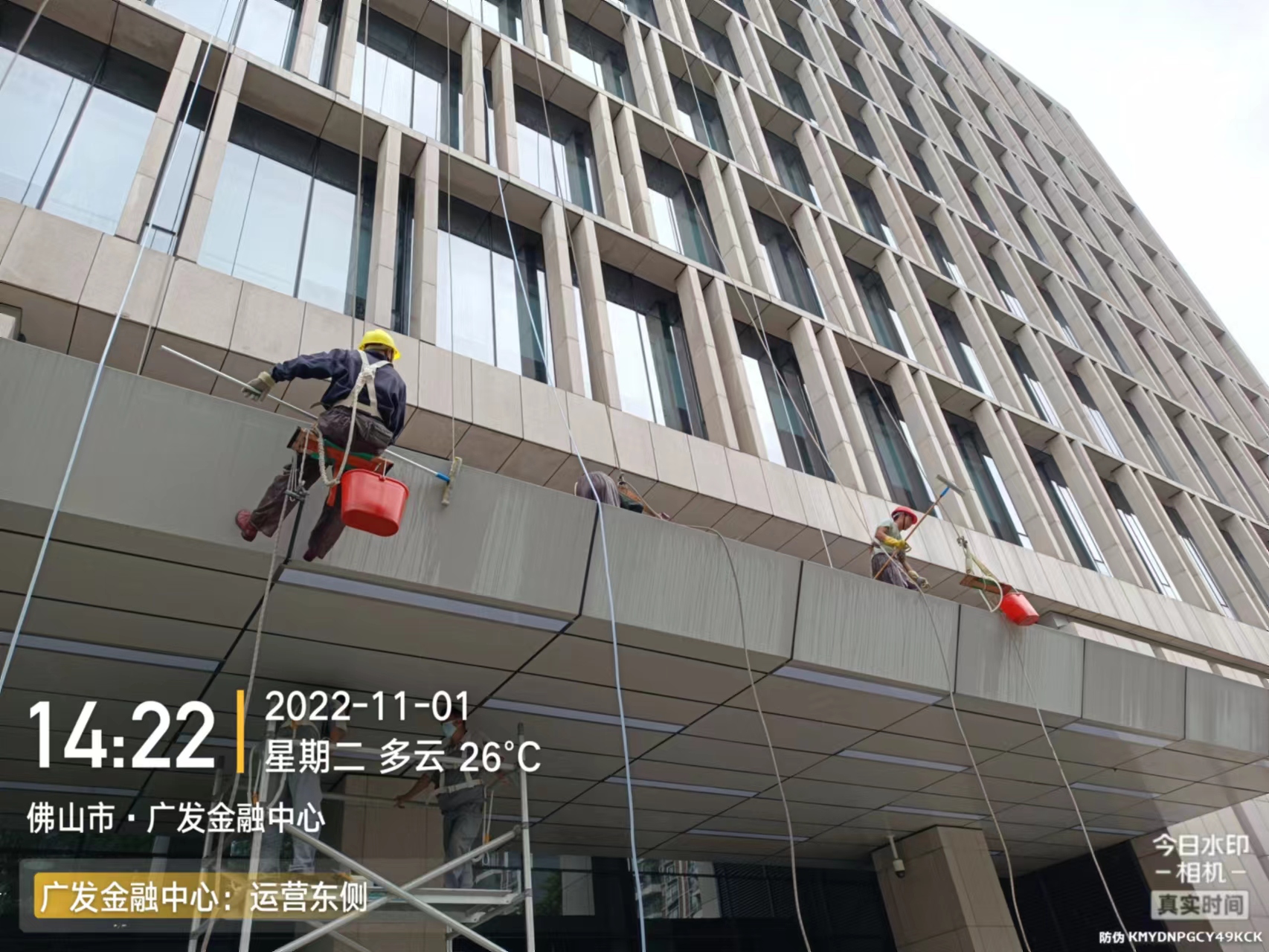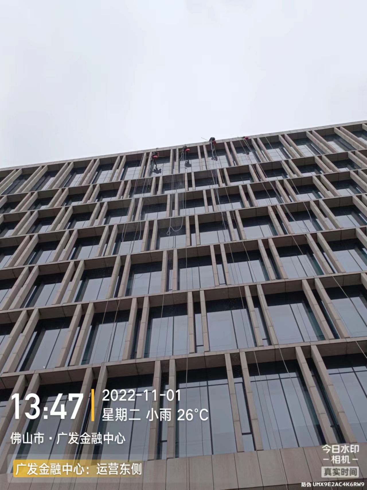 11月1日,附上我司在广发南海金融中心清洗外墙工作照片。今日操作人员为4人,均做好安全防护措施,符合高空工作要求。